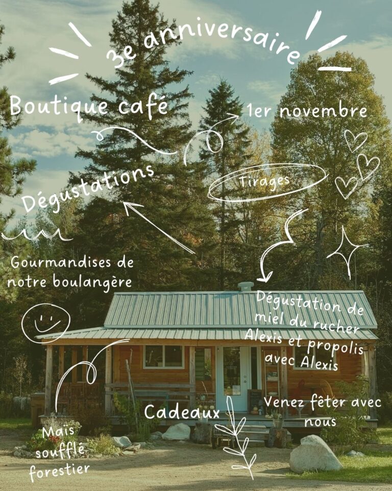 La Maison du Bonheur est située au cœur des montagnes, dans la belle municipalité de Saint-Côme. Notre boutique-café est un complément à notre atelier de transformation et à notre boutique en ligne. C’est une belle vitrine pour nos produits à base de plantes forestières, un petit espace gourmand et un endroit où nous mettons de l’avant nos coups de cœur d’artisans de la région.
